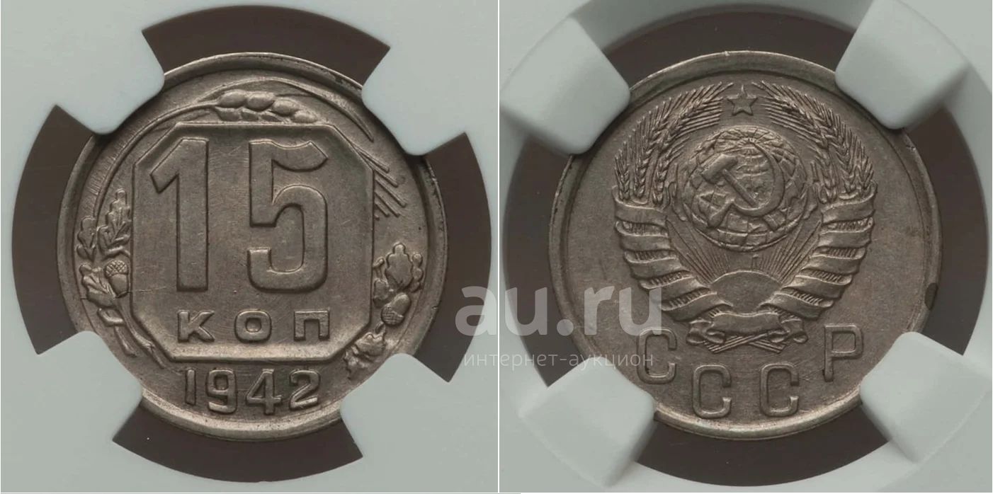 Редкая монета СССР погодовка 15 копеек 1942 года в слабе американской грейдинговой компании
